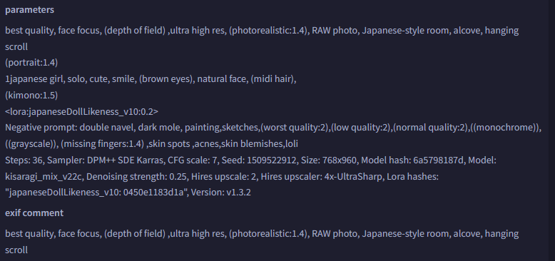 Stable Diffusionで生成された画像には、自動で生成に使ったメタ情報が埋め込まれるようです。