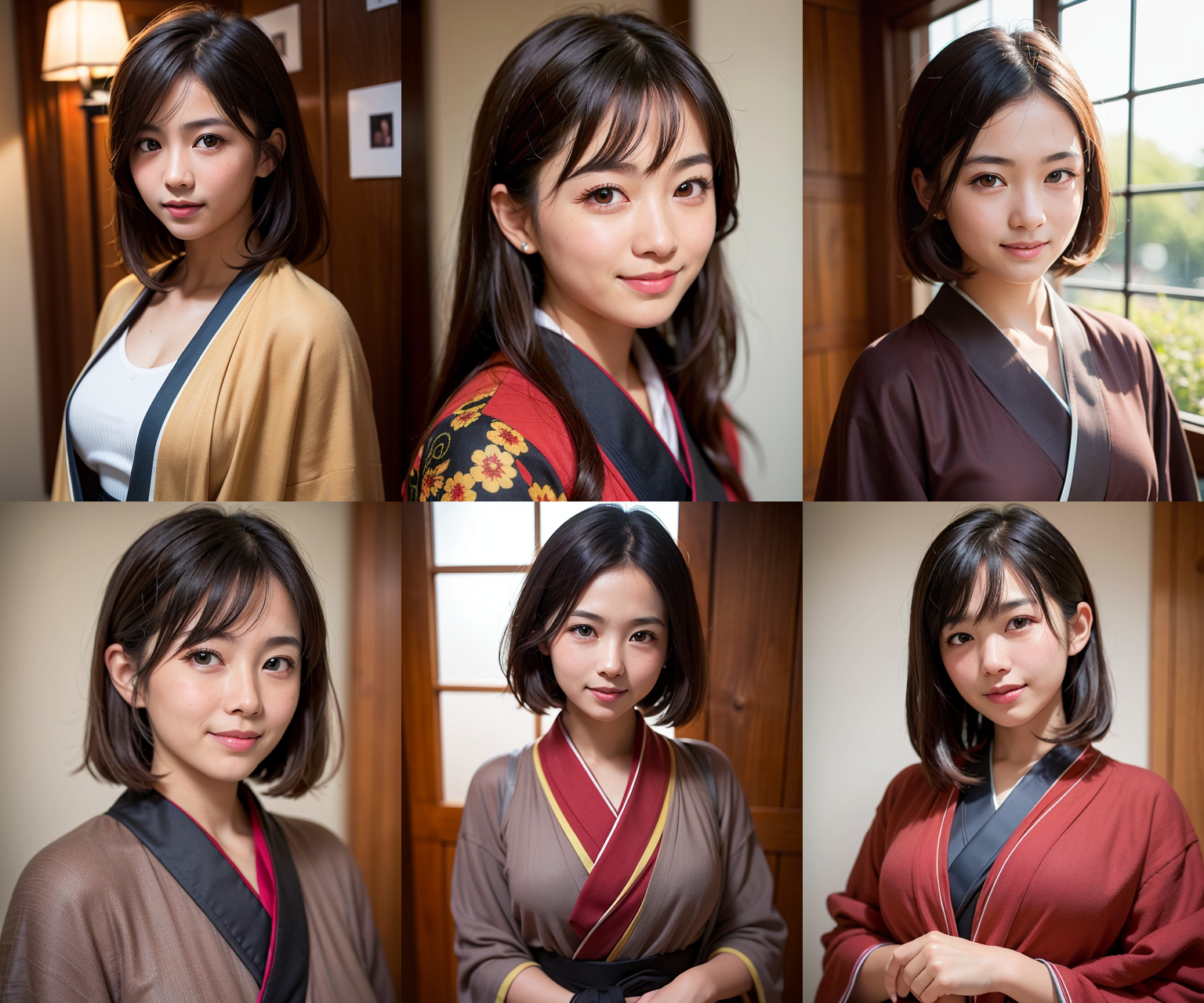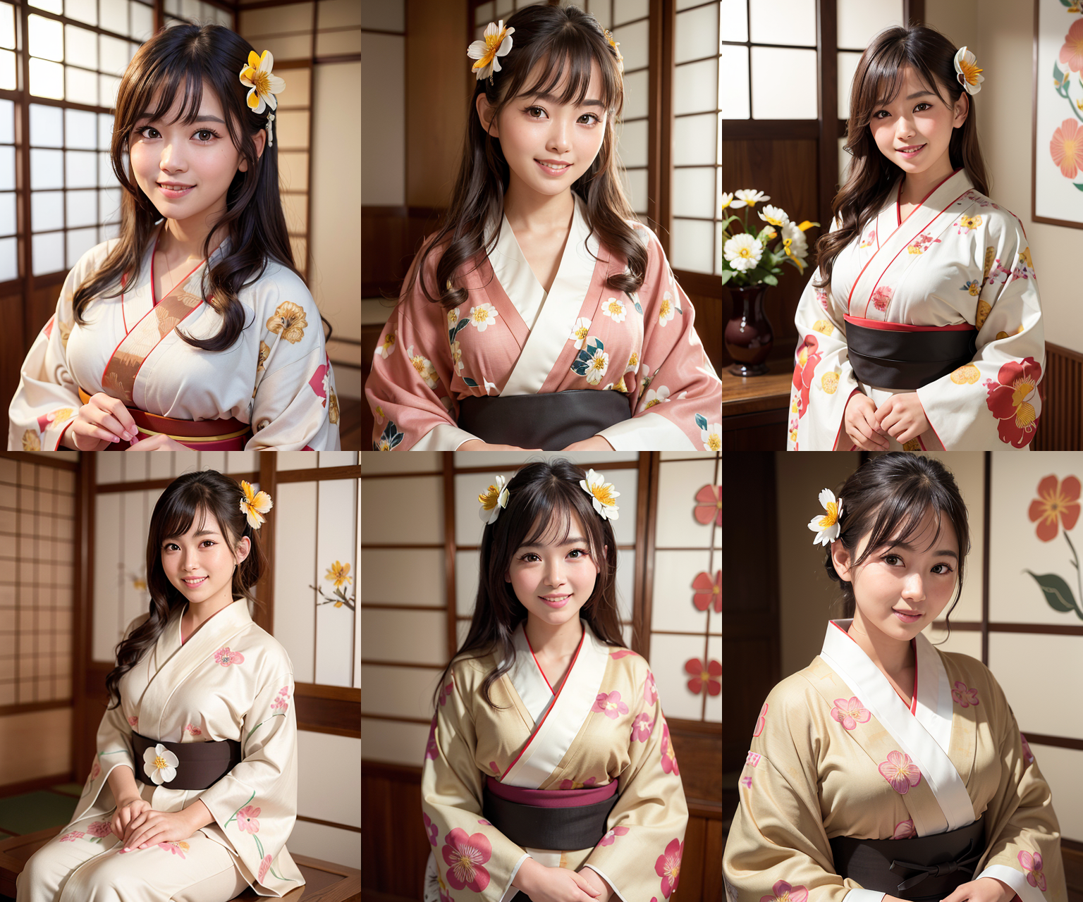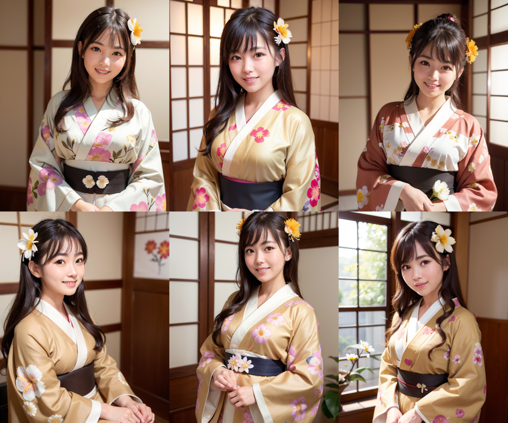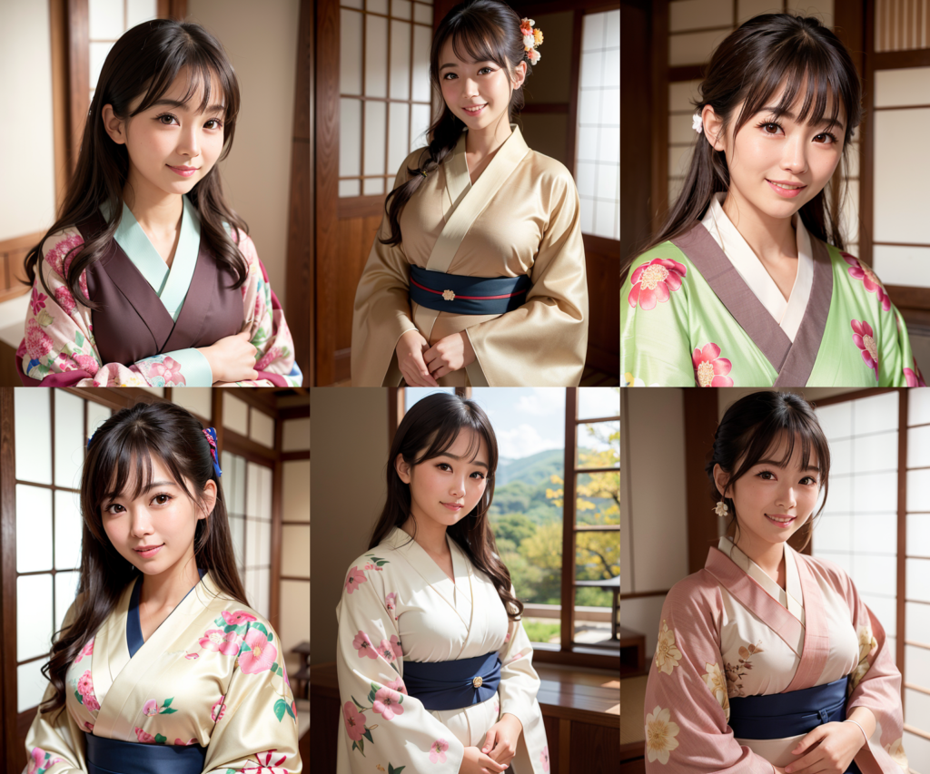 kisaragiMixで生成した画像は、プロンプトや設定が全く同じではありますが結果が一致しません。着物の色が大きく違い、被写体の向きも違います。プロンプトには「kimono」としか記載していないのでどのような色や柄かは