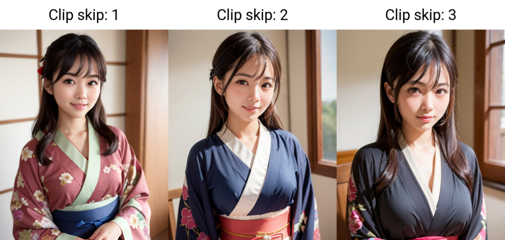 プロンプトは同じで、Clip Skipを1~3と変化させSeed=-1(ランダム)で出力した結果です。